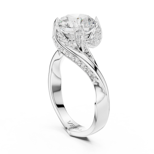 Inspired by the gentle bloom of petals at dawn, this ring embodies soft, organic elegance. A brilliant round center diamond rises from a sculptural crown of fluid, petal-like forms, each accented with delicate pavé to create an ethereal glow from every angle. The band flows into a graceful twist, echoing...