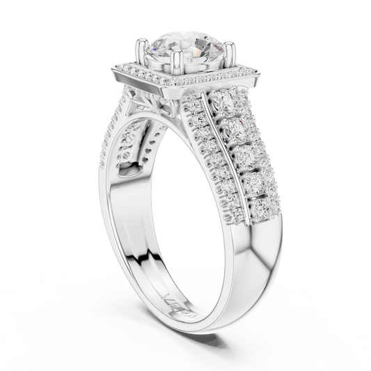 Bold yet beautifully composed, this ring pairs modern pavé brilliance with a regal square halo to create a silhouette that feels both majestic and contemporary. At its center, a round brilliant diamond rests within a geometric frame, achieving a rare harmony between softness and structure. Twin rows of pavé diamonds...