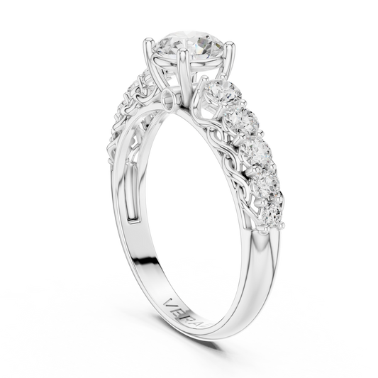 The Ribbon Trinity Ring celebrates love in motion. A radiant round brilliant center diamond is flanked by a cascading sequence of graduated stones along a sculpted cathedral shank. Beneath, a delicate lattice evokes a flowing ribbon intertwining hearts, shared moments, and promises yet to unfold. Handcrafted with precision and grace,...