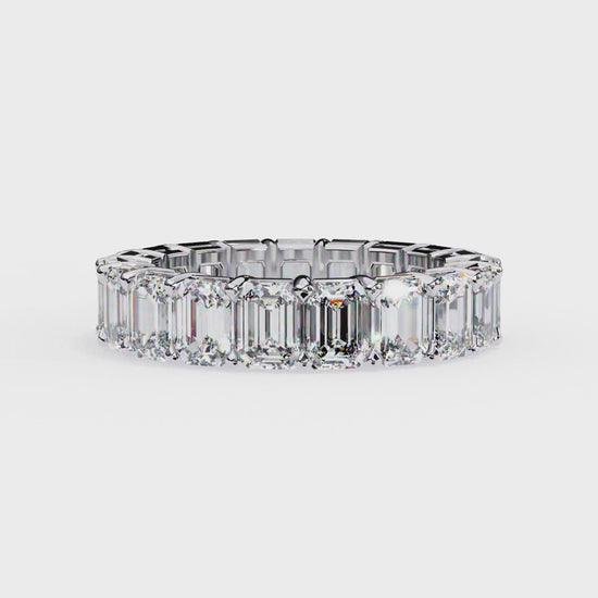A seamless ribbon of brilliance, this eternity band captures forever in its most elegant form. Each emerald-cut diamond is precisely matched for clarity, proportion, and luminosity, creating an unbroken line of geometric light around the finger.