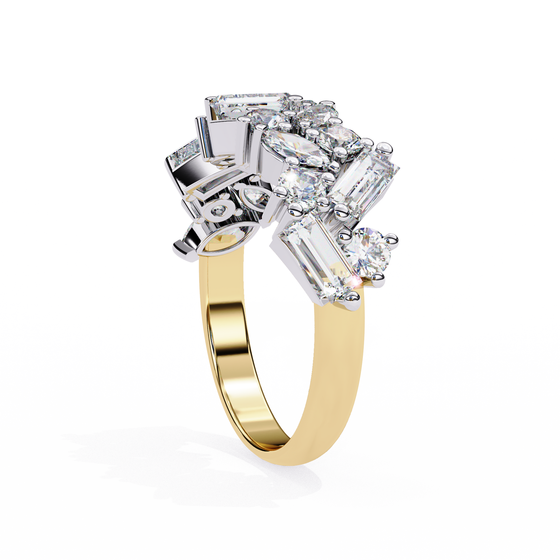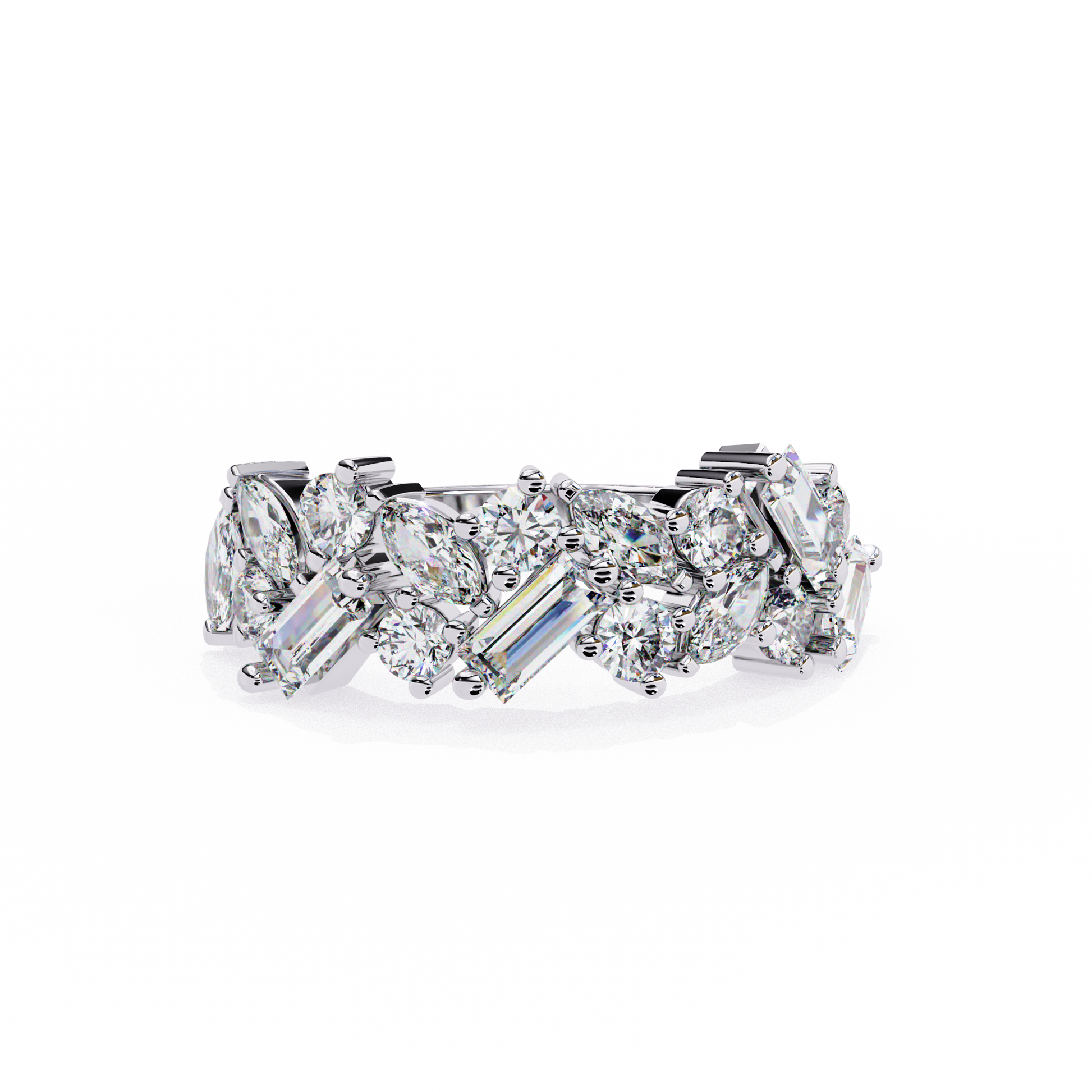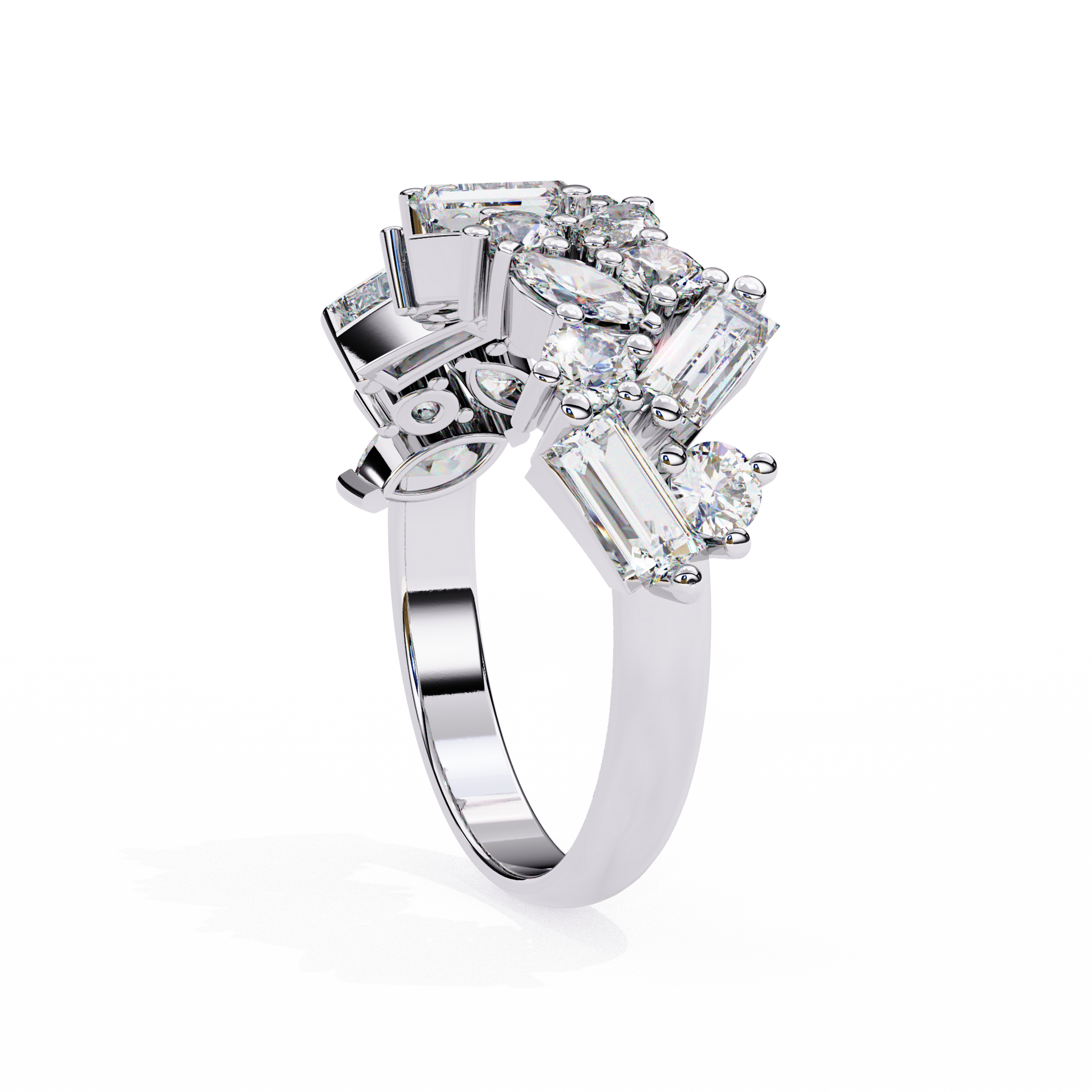 asymmetrical arrangement of round, marquise, and baguette-cut lab-grown
