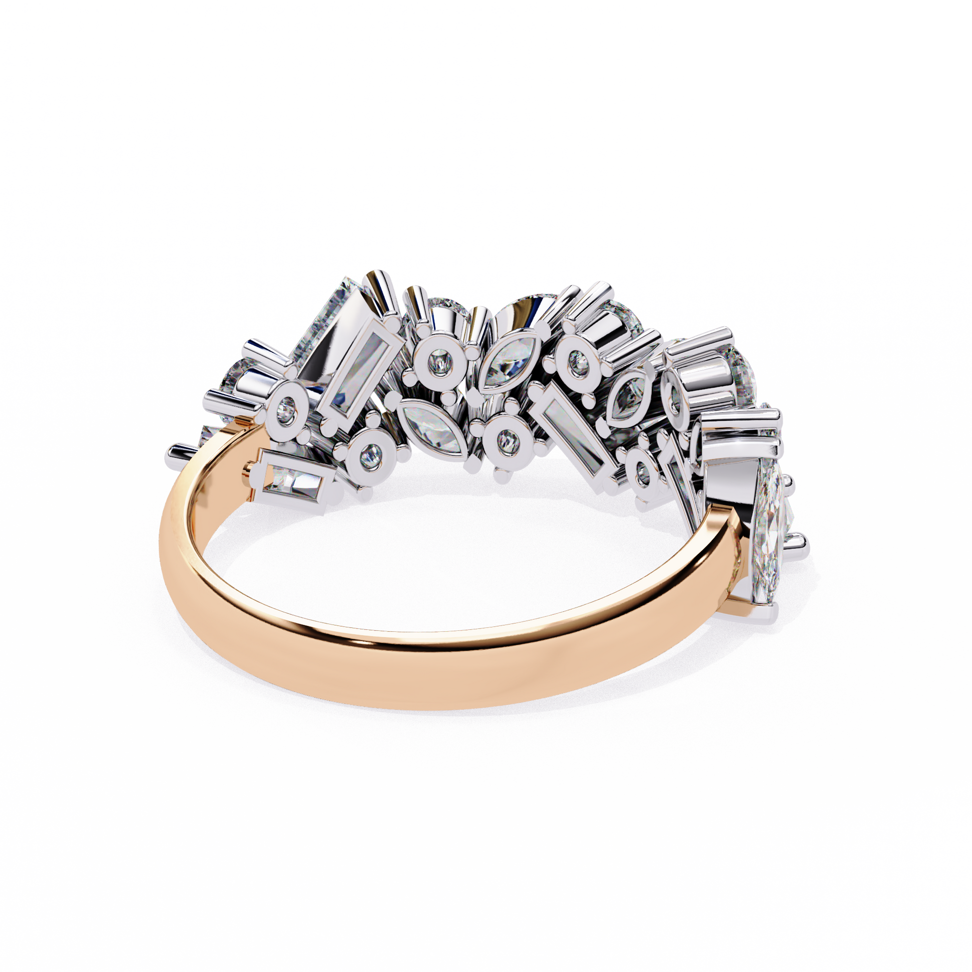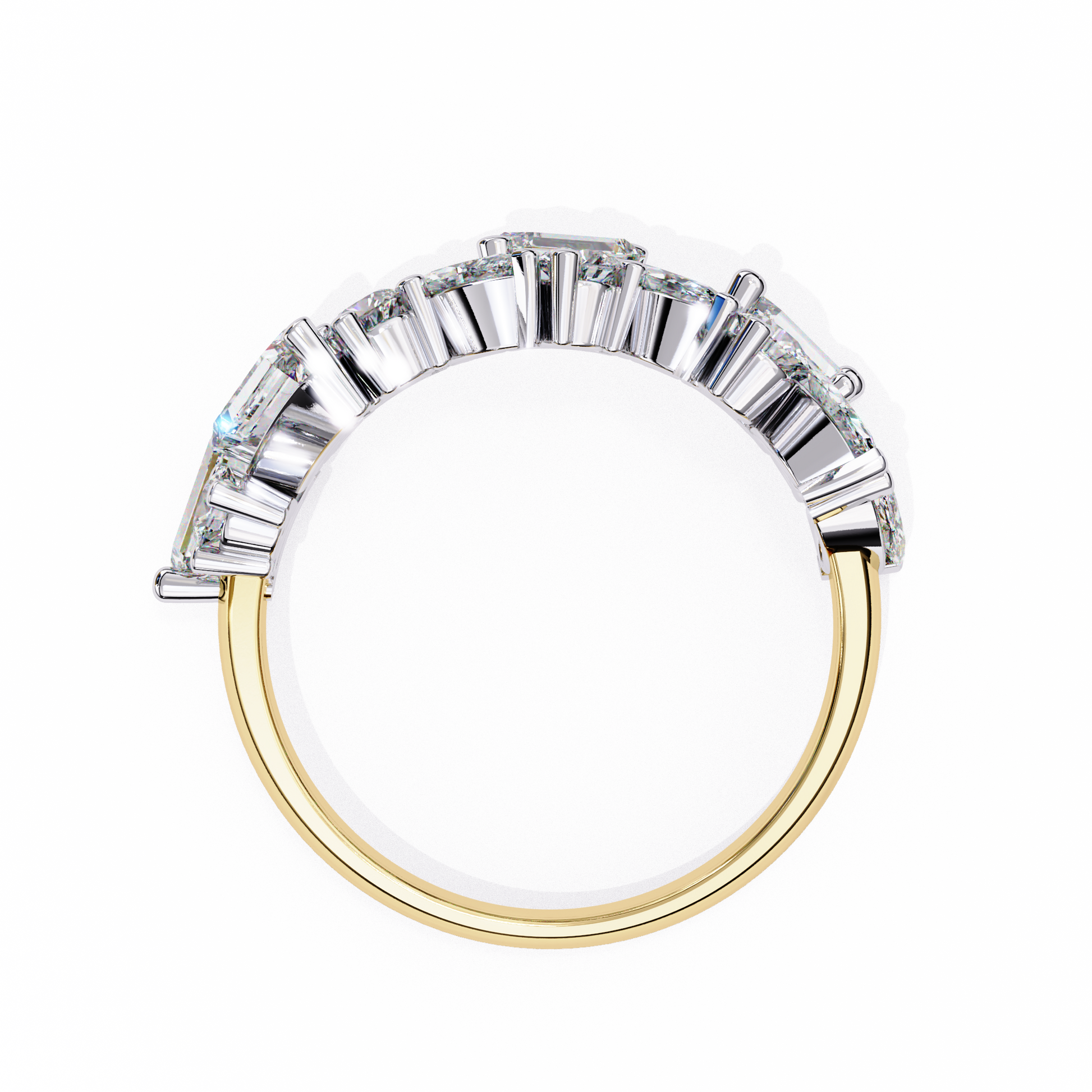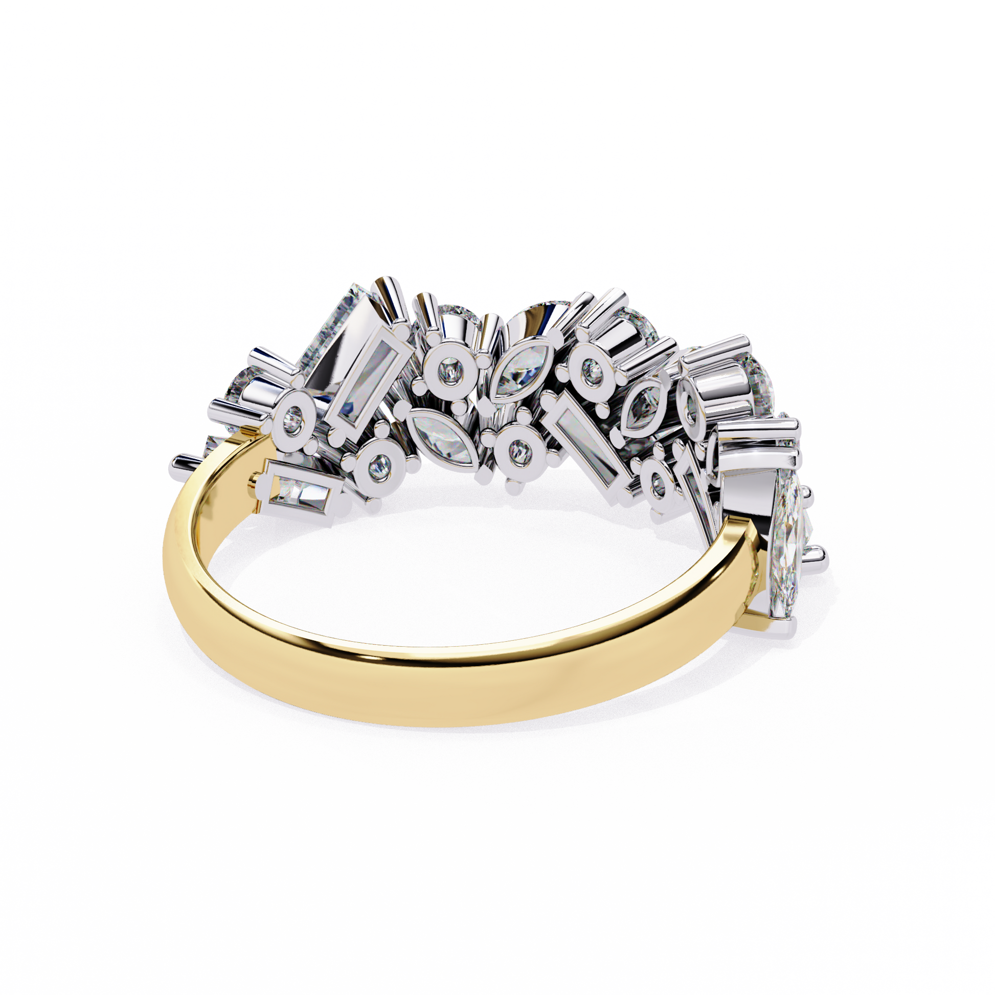 asymmetrical arrangement of round, marquise, and baguette-cut lab-grown