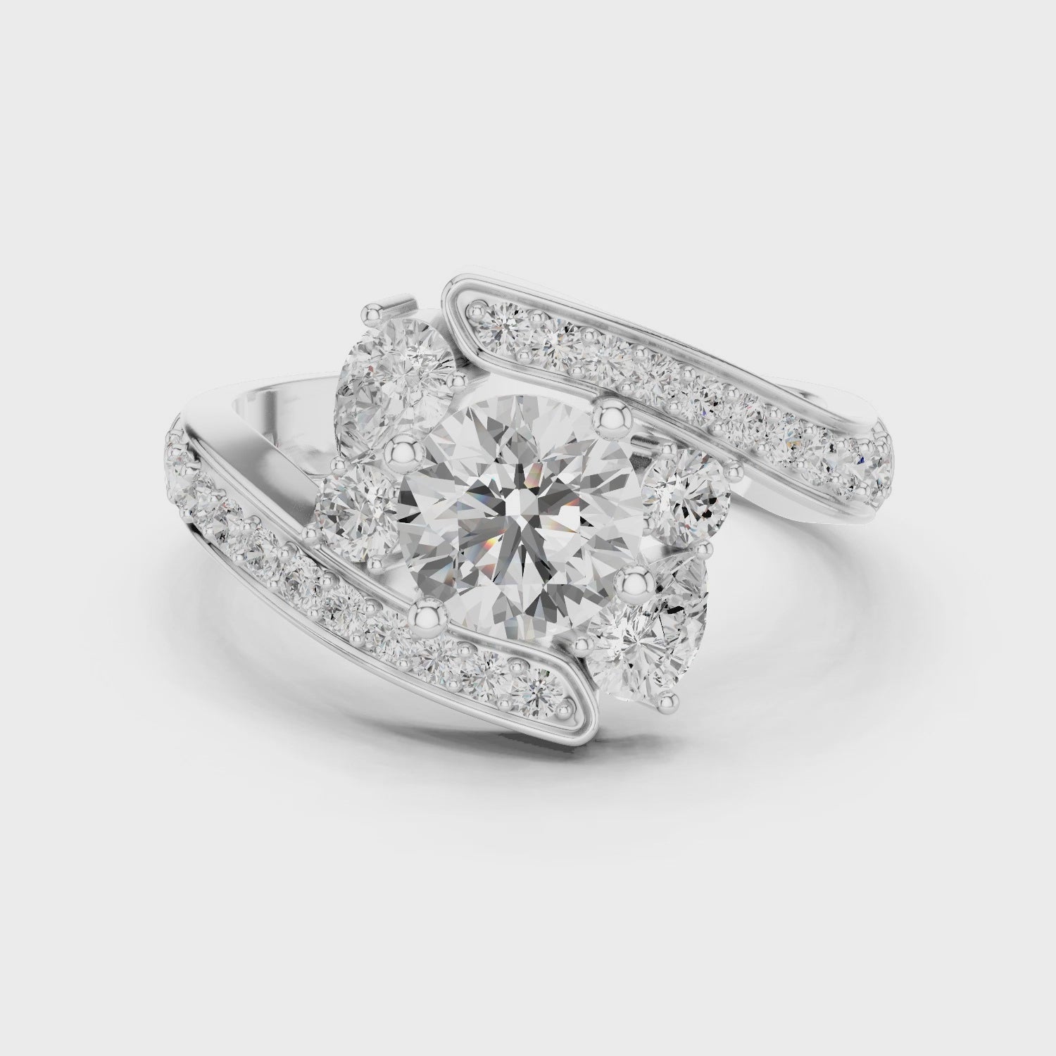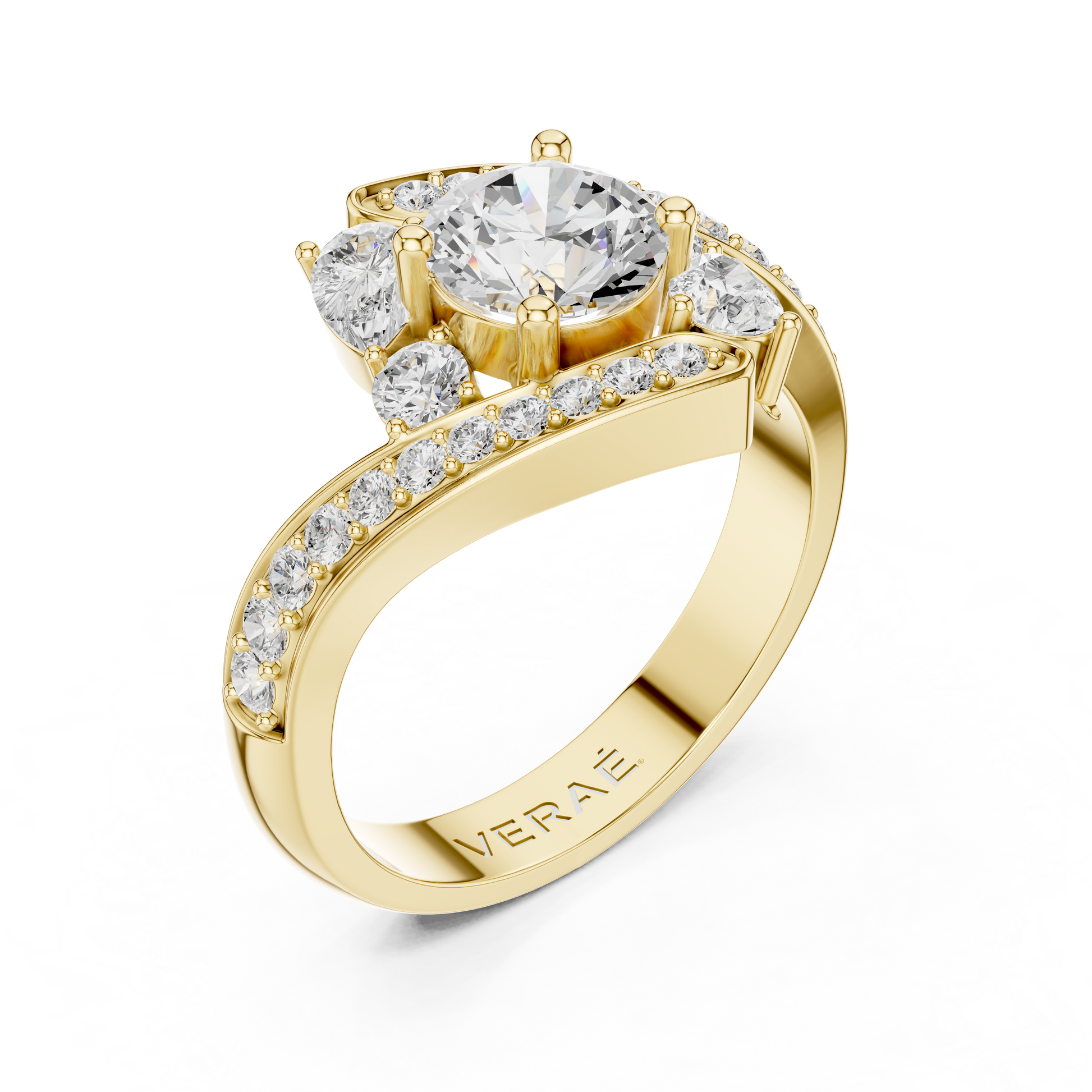 The Radiant Embrace Ring captures the moment love finds its perfect balance. A luminous round diamond rises in a sculpted four-prong crown, framed by pear-shaped side stones that gently lean inward, an elegant symbol of protection and devotion.