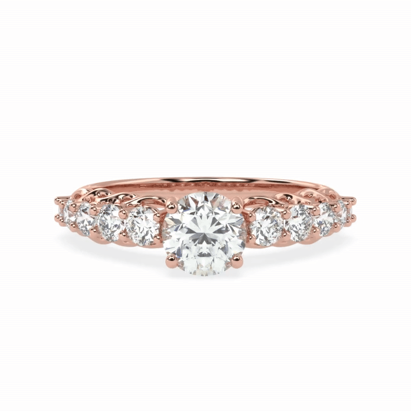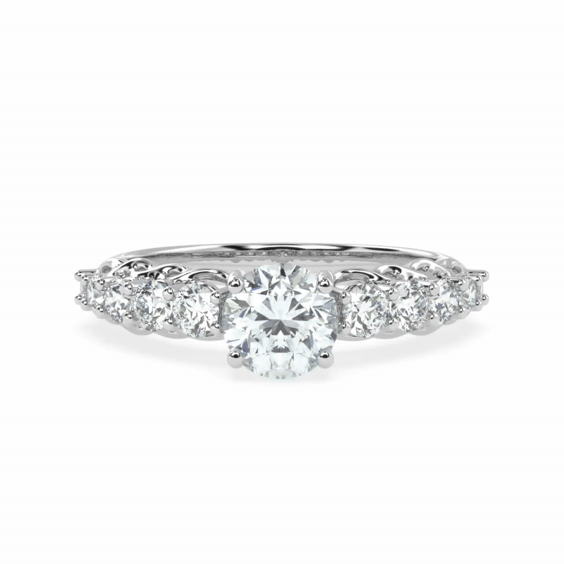 elegance. A radiant round brilliant centre diamond takes the spotlight, flanked by a